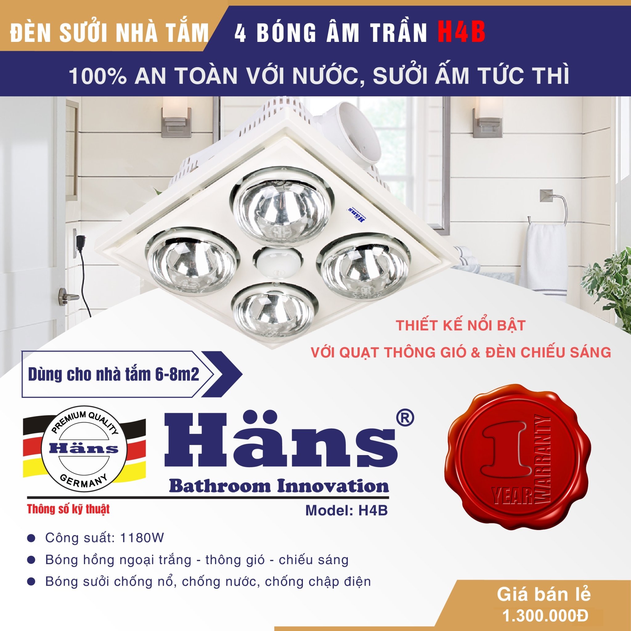 | Tên sản phẩm | Đèn sưởi nhà tắm Hans 4 bóng âm trần H4B |